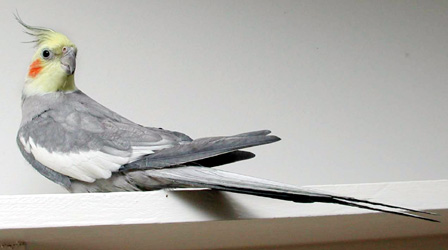 Sparky is a "hand-fed" Cockatiel. He's very people friendly. He does a great job of calling the horses to races.